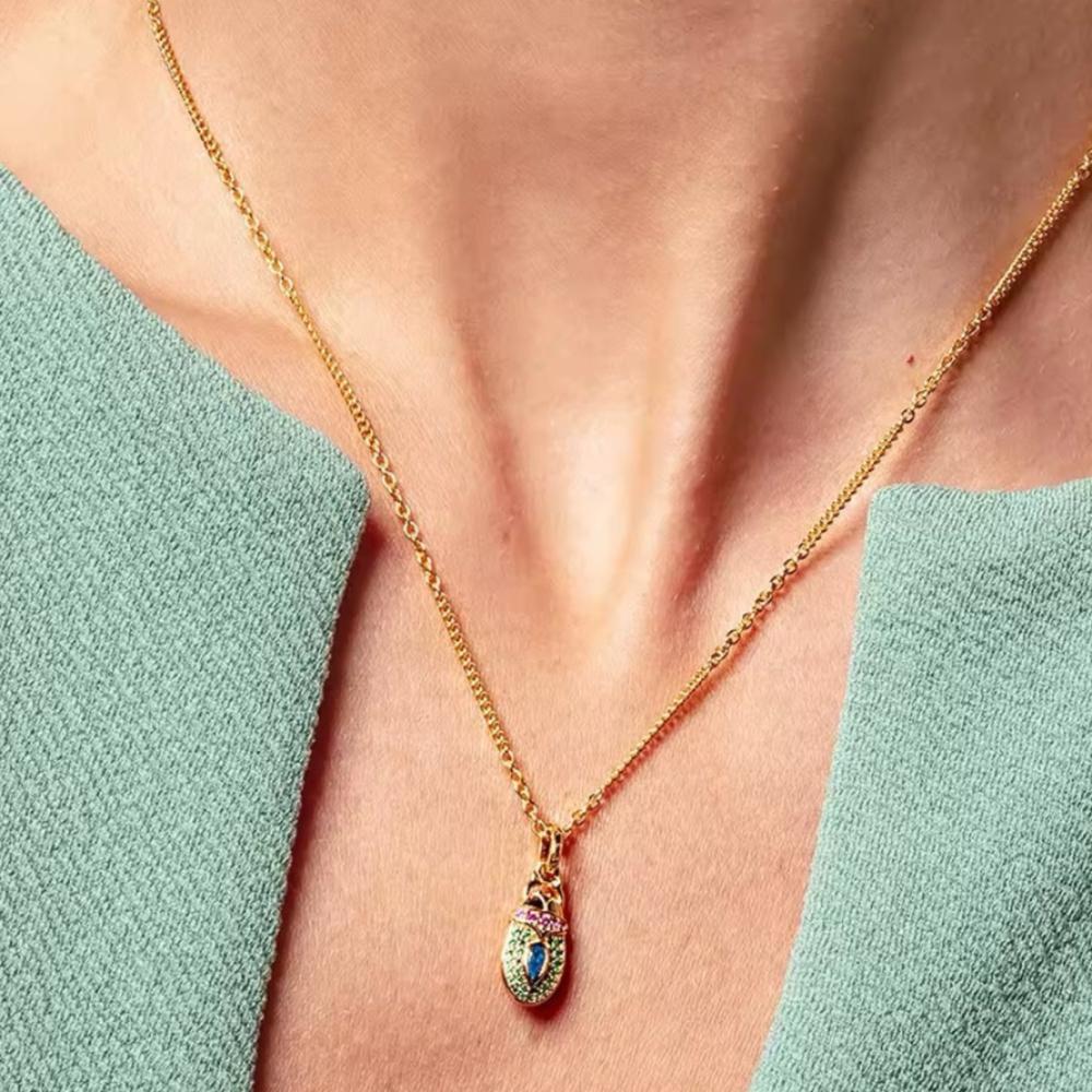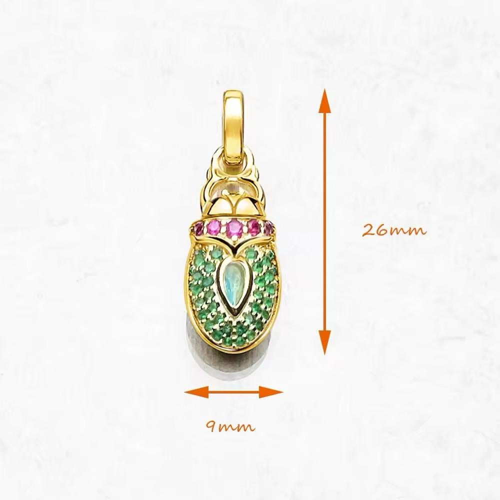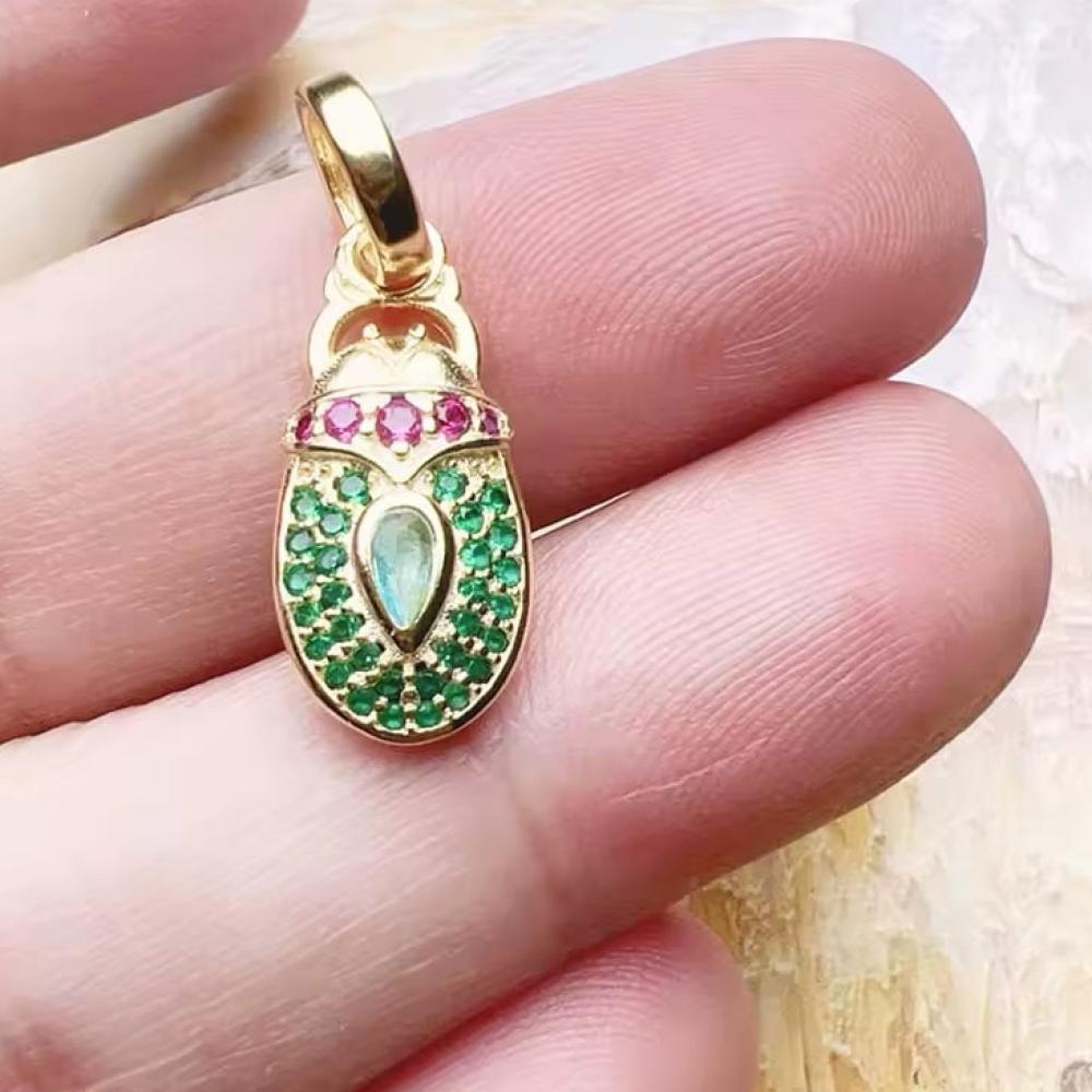 استمتعي بالسحر الغامض الذي تتميز به قلادة الخنفساء الذهبية المصنوعة من الفضة الإسترلينية والمطلية بالذهب عيار 18 المستوحاة من الرمزية القديمة والأناقة الخالدة. هذه القطعة الرائعة مصنوعة من الفضة الإسترلينية مع طلاء الذهب فاخر، وتتميز بتصميم خنفساء نابضة بالحياة مزينة بأحجار زركون خضراء ووردية مبهرة. يضيف حجر الدمعة المركزي نقطة محورية مشرقة تمثل التجديد والحيوية.
