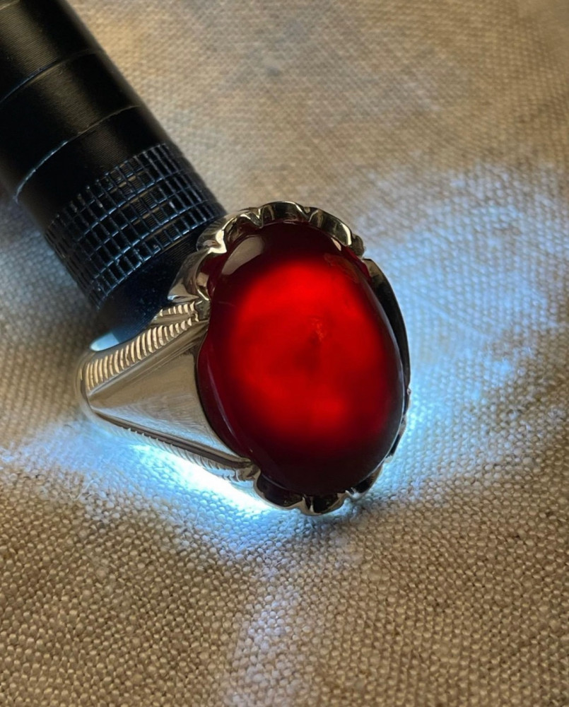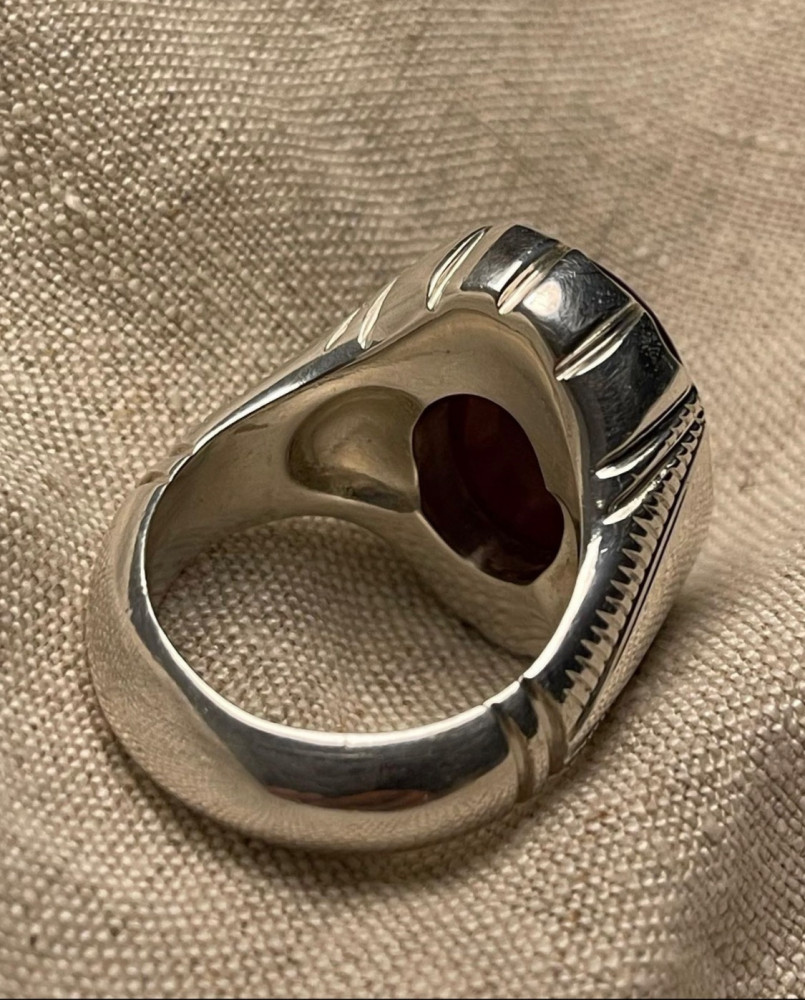 عقيق يماني كرزي غامق بضربات زعفران بطن جمر صياغة بحرينيه فضه ثقيله