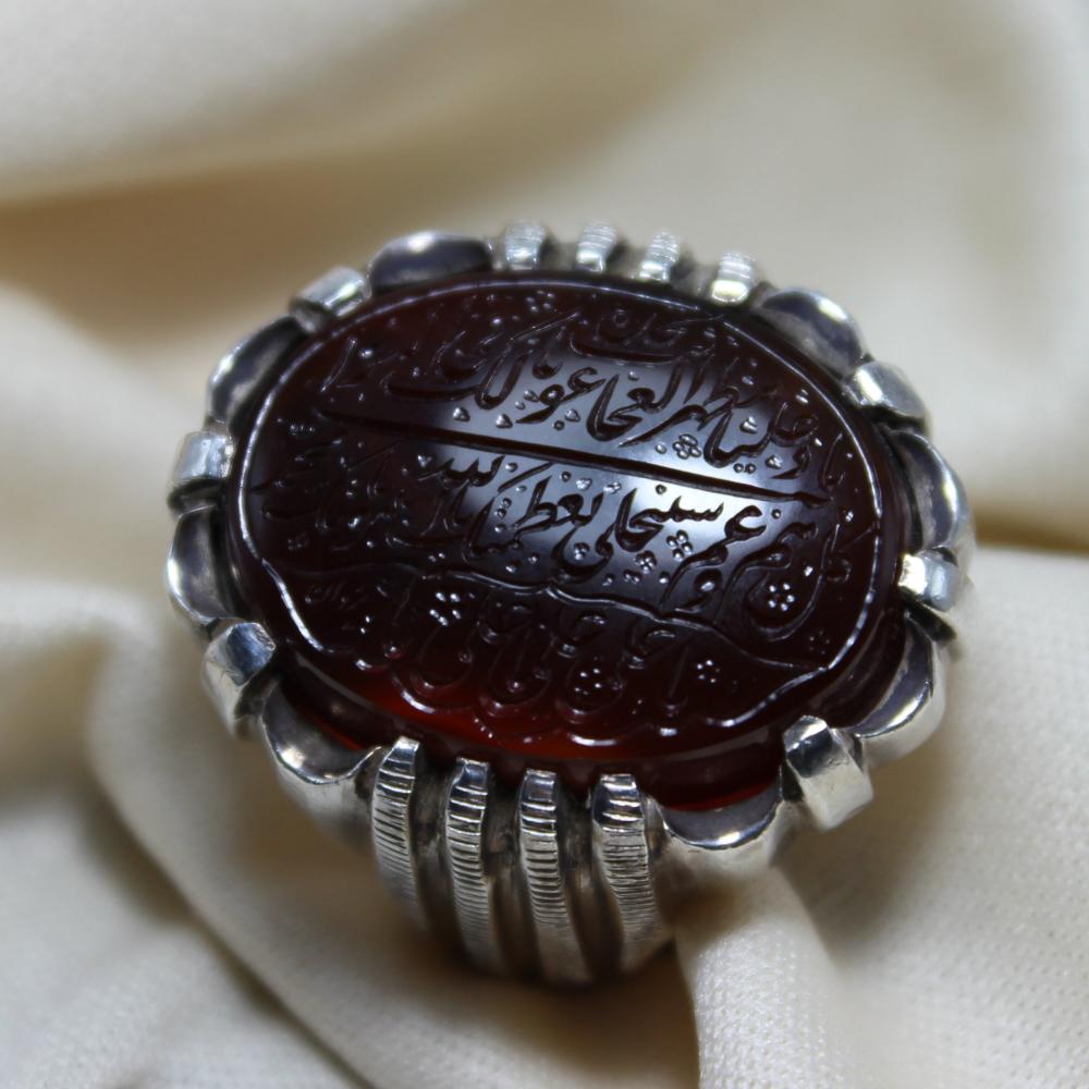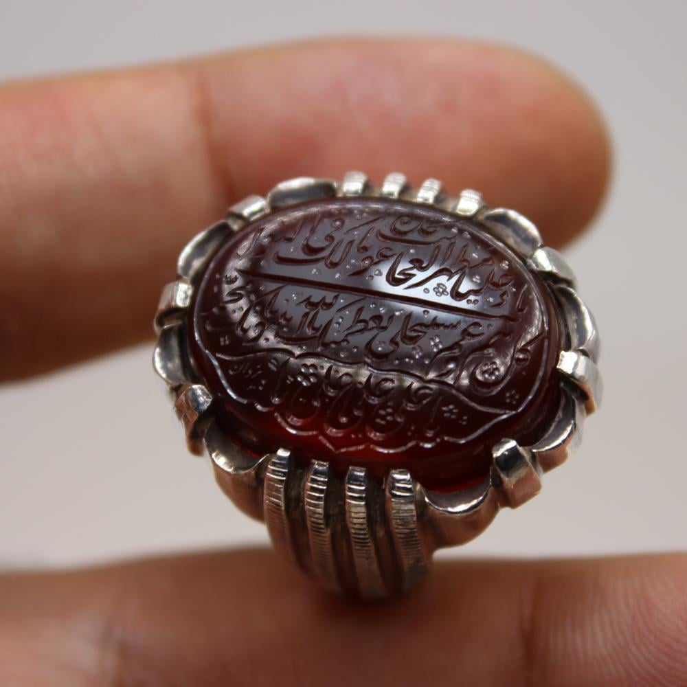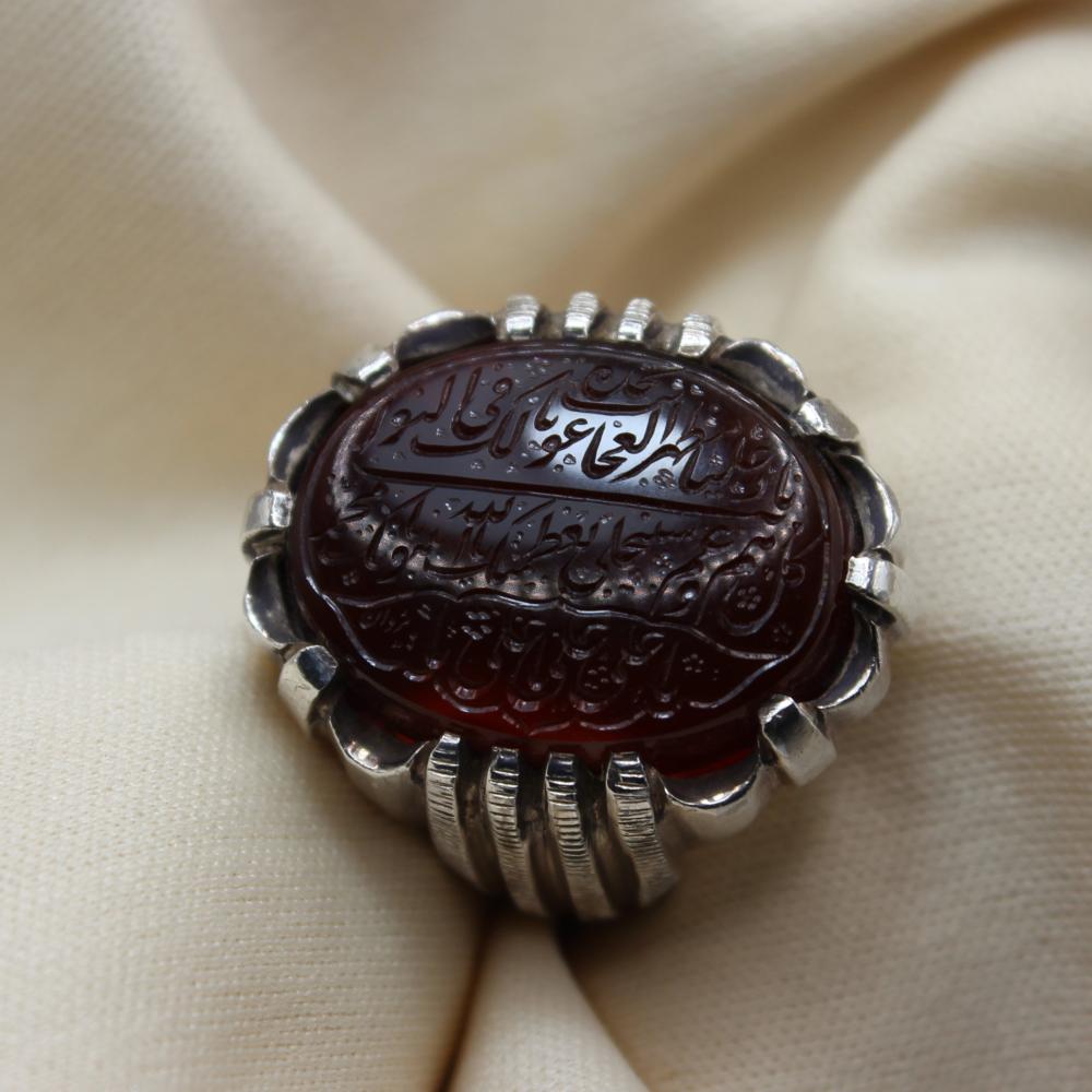 مخطوط ( نادِ علياً مظهر العجائب تجده عوناً لك في النوائب كل هم وغم سينجلي بعظمتك يا الله بنبوتك يا محمد، بولايتك يا علي يا علي يا علي ) + خلف الحجر ( لافتى الاعلي ولاسيف الا ذو الفقار ).