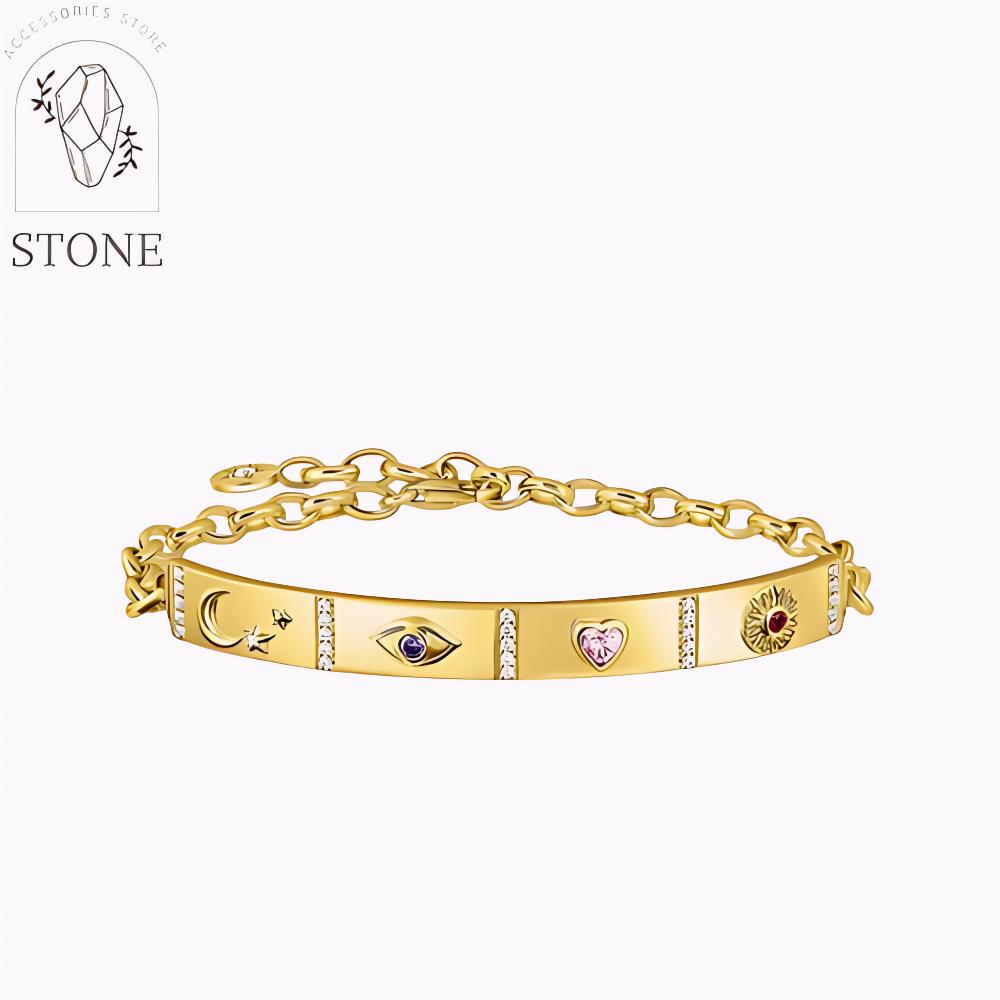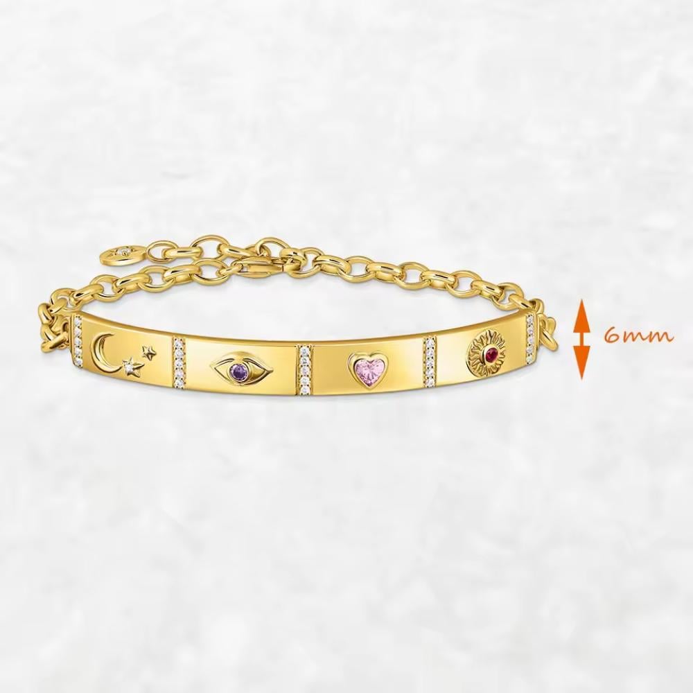 سوار فاخر مصنوع من الفضة الاسترلينية المطلية بالذهب، بتصميم عصري مزين برموز أنثوية لامعة (القمر، العين، القلب، والشمس) مع لمسات من أحجار الزركون البراقة. قطعة أنيقة تحمل معنى وجمال في آن واحد، لتمنحك إطلالة متجددة تناسب يومك ومناسباتك الخاصة.
