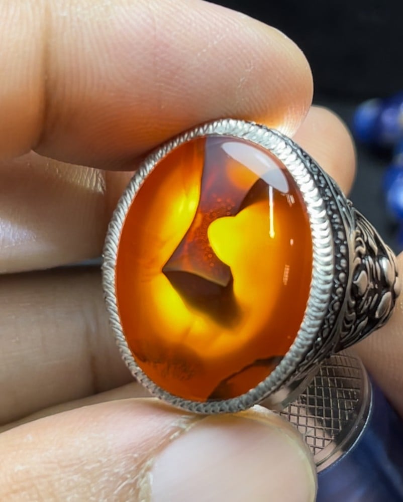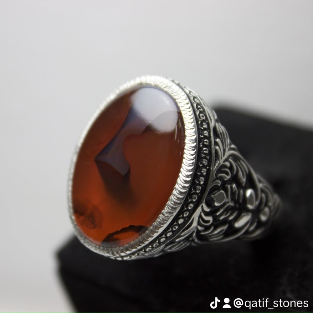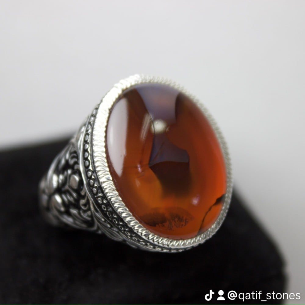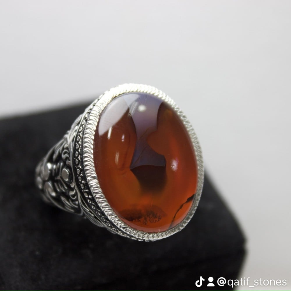 عقيق يماني نوادر الخام الأحمر الزجاجي المشجر المصور تبارك الرحمن صياغة محمد عارف"عيار الفضة 990"
