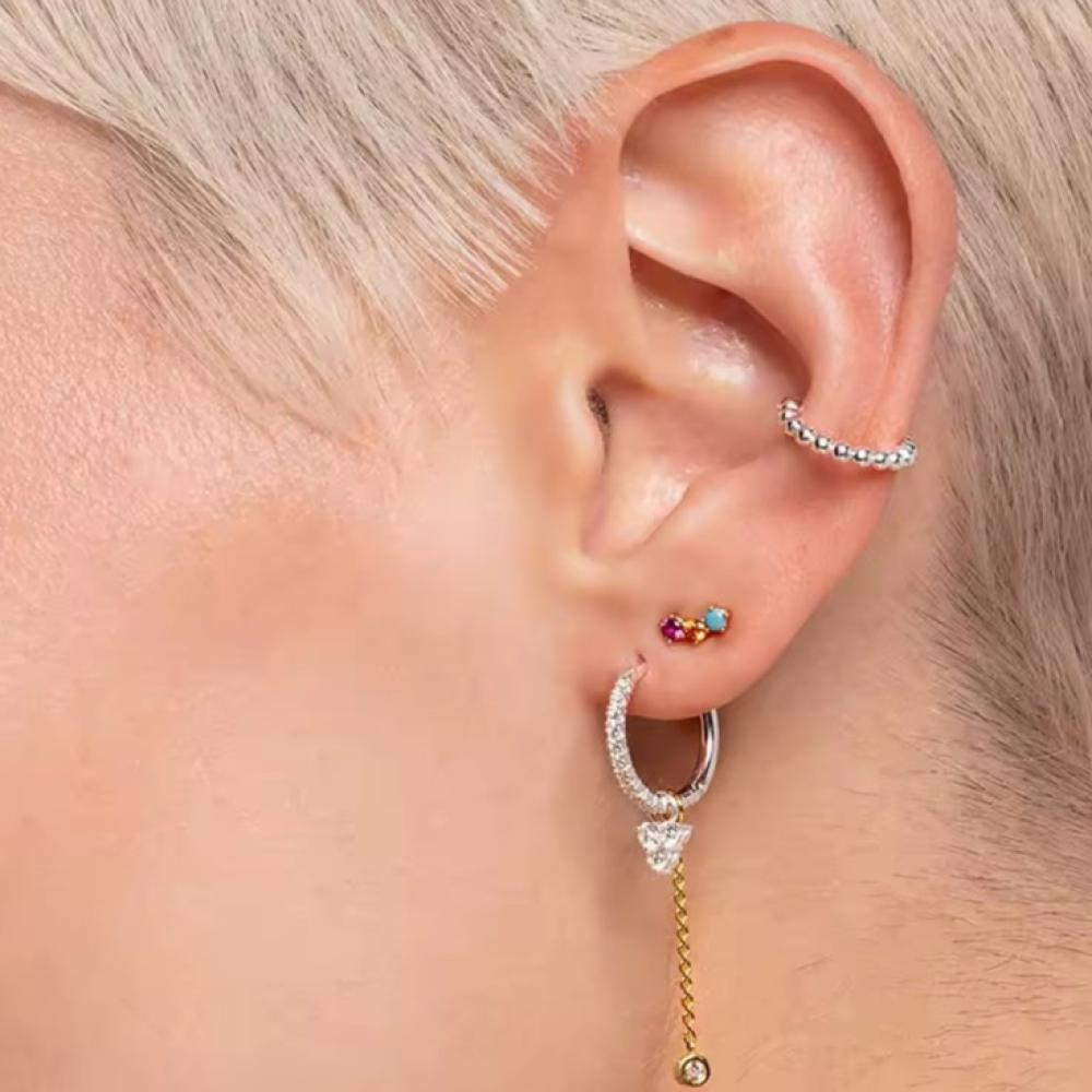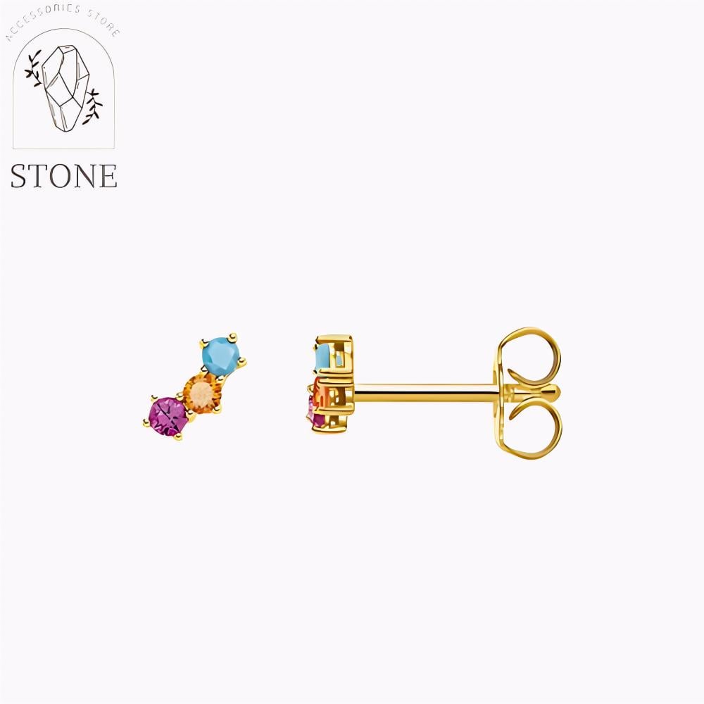 ارتدي سحر الألوان في لمسة واحدة مع أقراط فسيفساء الألوان المصنوعة من الفضة الإسترلينية المطلية بالذهب الفاخر، والمرصعة بأحجار الزركون بأشكال هندسية متناسقة تجمع بين الدائرة، القطرة، والمثلث.