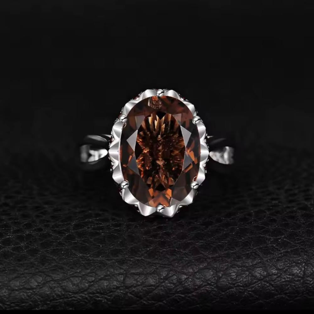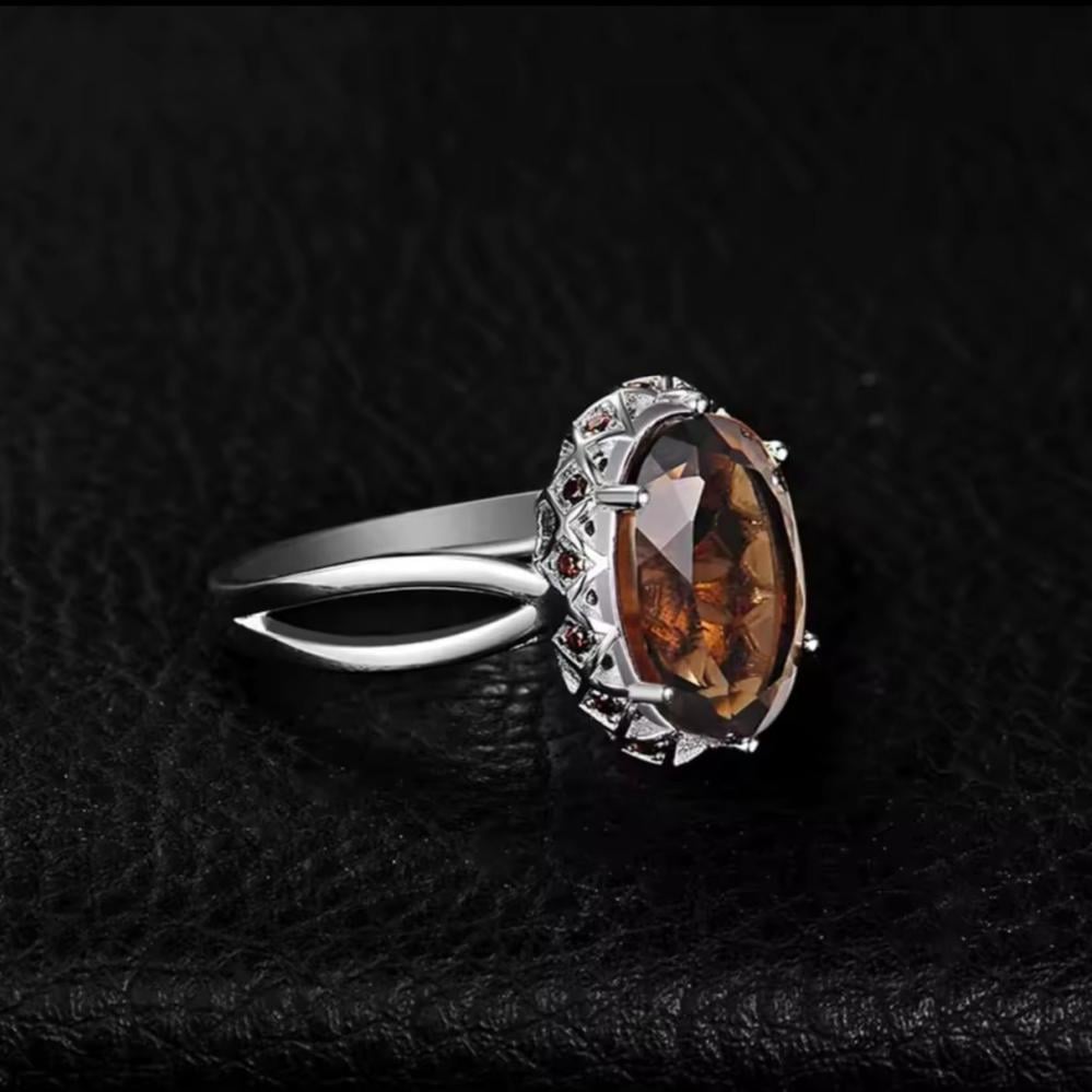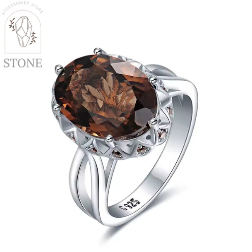خاتم من الفضة مطعم بحجر سموكي كوارتز الطبيعي