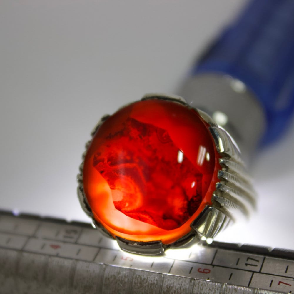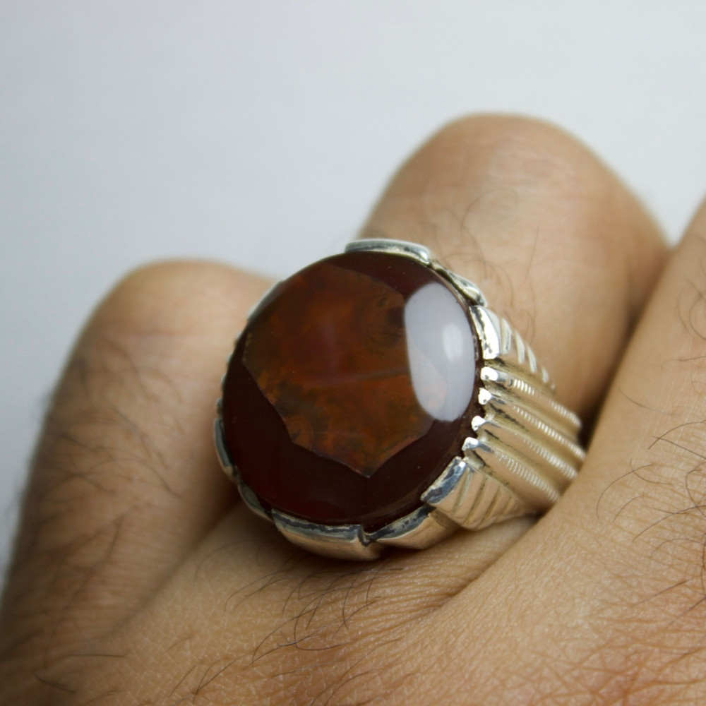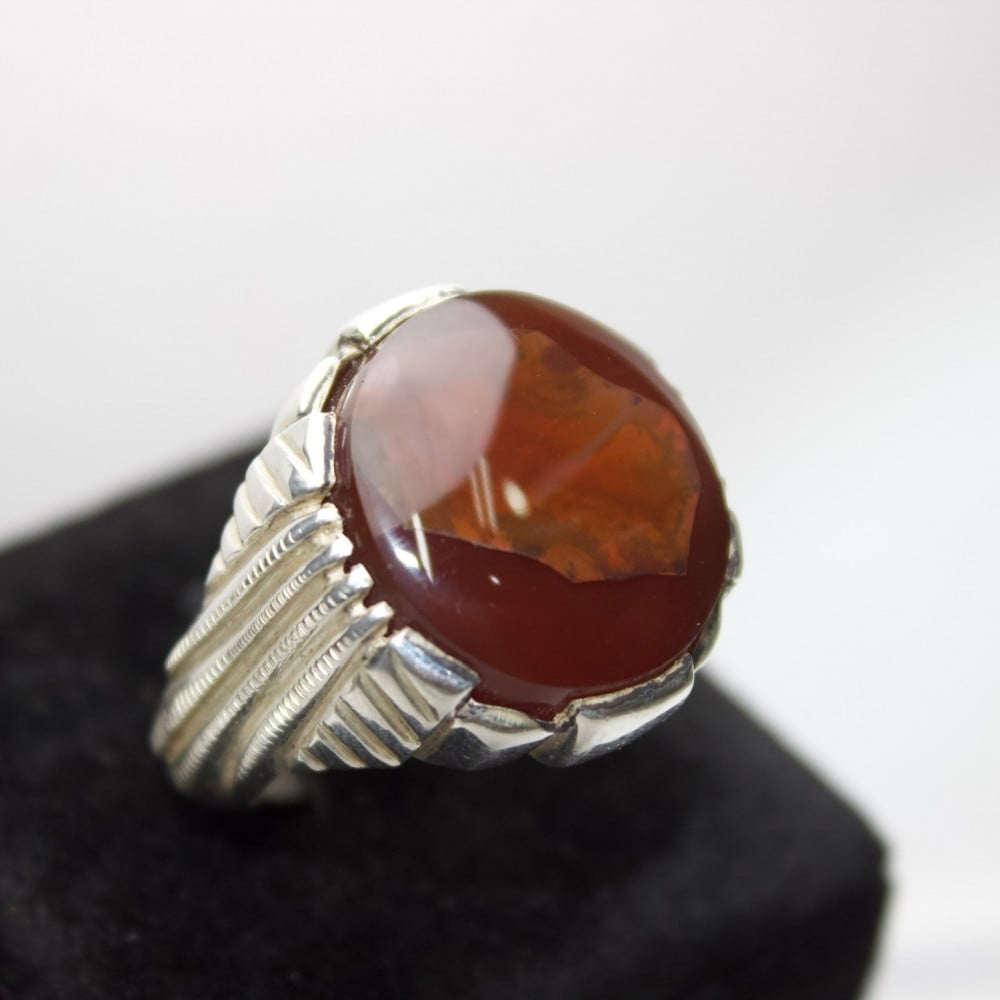 عقيق يماني كرزي مصور بالزعفران تبارك الرحمن ثلاثي الأبعاد قطع دائري صياغة ورشة ( شيرزاد ) فضة عيار 980