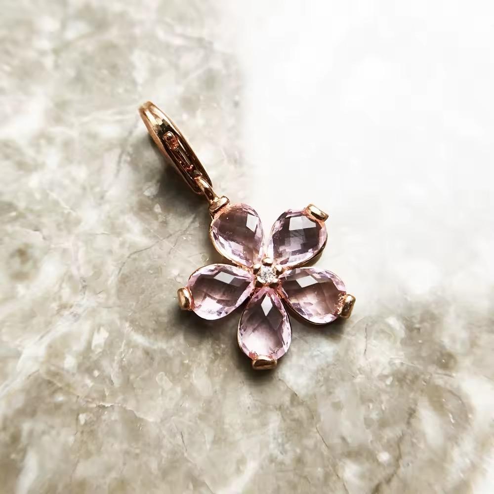 أضف لمسة من الأناقة والسحر إلى مجموعة مجوهراتك مع هذه القلادة الرائعة الزهرة الوردية من الفضة الإسترلينية. تتميز هذه القلادة بتصميم جميل على شكل زهرة، وهي مزينة بـستة أحجار زركون طبيعي وردية متعددة الأوجه، تشع بريقًا رقيقًا يعزز أي زي. يوفر إطار الفضة الإسترلينية المطلي بالذهب الوردي تباينًا فاخرًا، مما يوفر المتانة والأناقة في قطعة واحدة مذهلة.