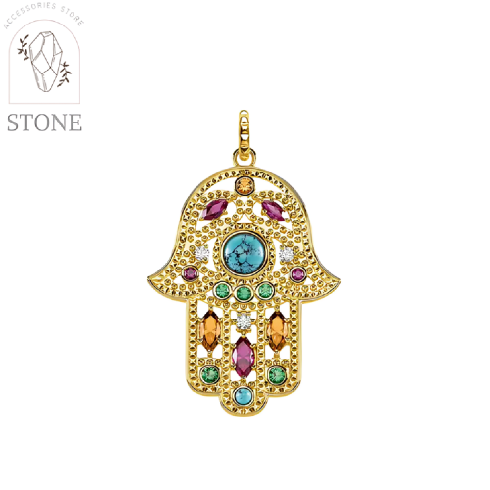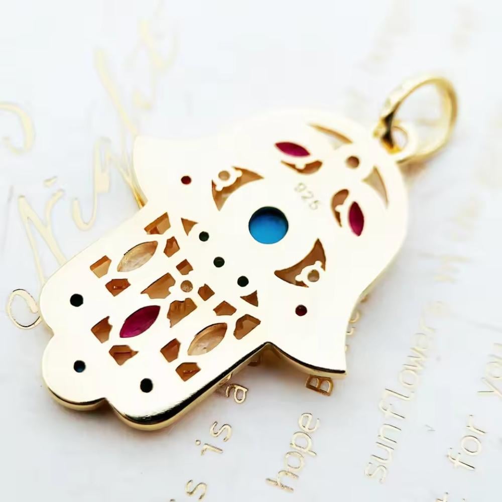 تألقي بلمسة من السحر الشرقي مع قلادة اليد الحارسة المصنوعة من الفضة الإسترلينية المطلية بالذهب الفاخر، والمطعمة بأحجار كريمة متعددة الألوان تمنحها طاقة إيجابية وجمالاً آسراً.